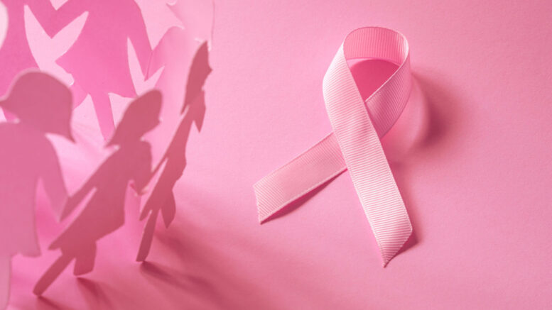 Sweet pink ribbon shape with girl paper doll on pink background for Breast Cancer Awareness symbol to promote in october month campaign