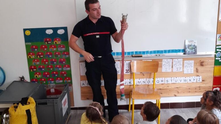 Photos de l’intervention d’un pompier dans la classe de MS qui a eu lieu lundi 4 juillet 2022. Les enfants, Mr Valnet et Mme Ophélie Figent ont découvert le métier de pompier et le matériel avec lequel il travaille.😄