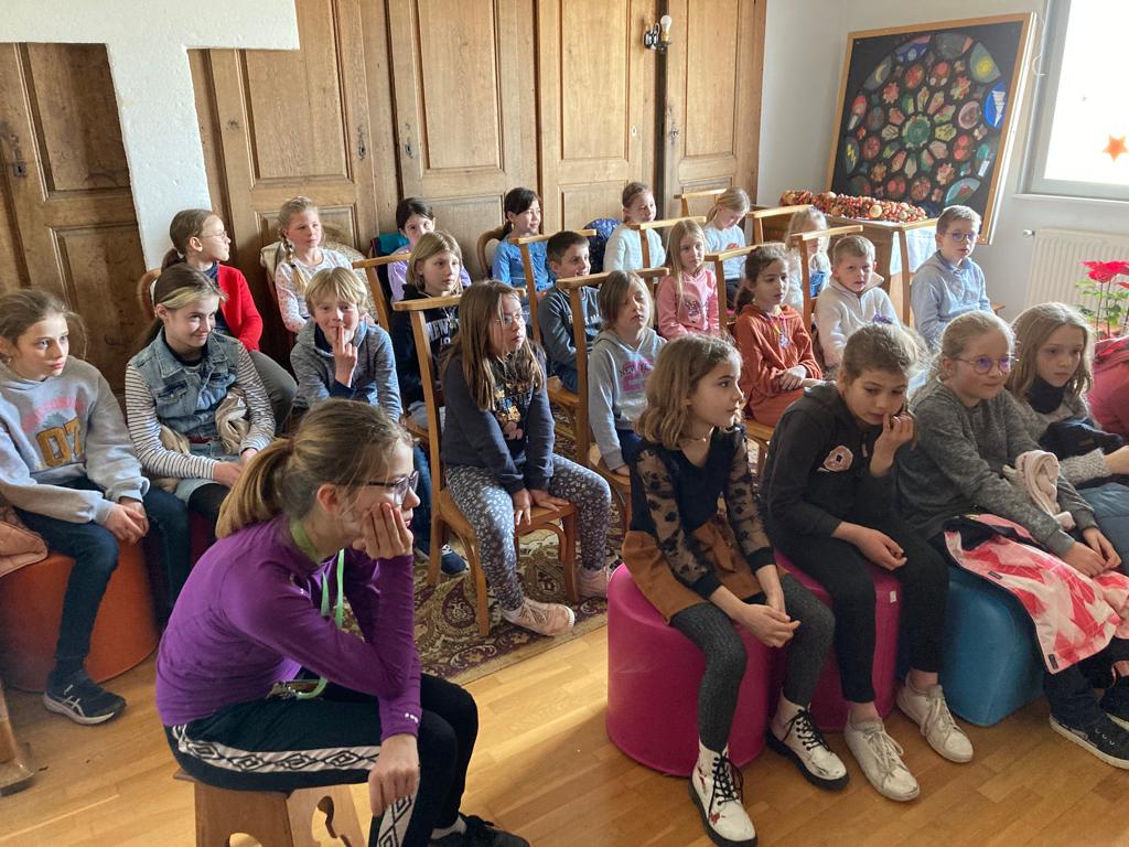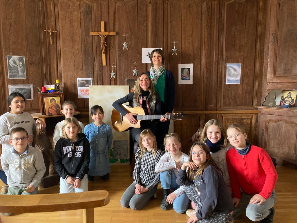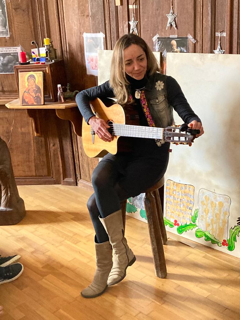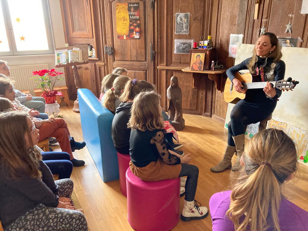 Originaire de Franche-Comté et installée au Québec depuis plusieurs années, c’est avec une grande joie que Patricia Shayato est venue partager quelques-unes des ses compositions auprès des enfants de l’école du Sacré Coeur pendant la pause méridienne. Accompagnées de sa guitare, les chansons partagées à cette occasion prennent place dans un conte invitant à revenir à l’intérieur, à se reconnecter avec le coeur, avec la nature et le vivant. Les enfants ont participé à cette pause musicale avec beaucoup d’enthousiasme et de spontanéité.