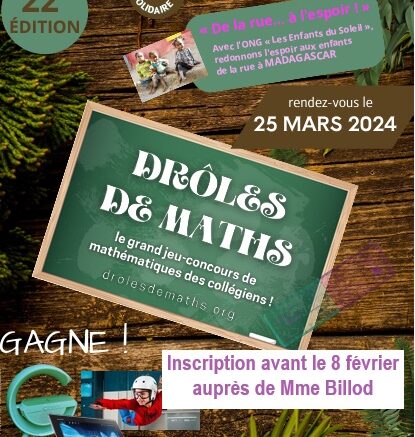 Le collège organise pour la 1ère fois le concours Drôles de maths pour la semaine des mathématiques dont le thème est: « l’important c’est de participer ! »