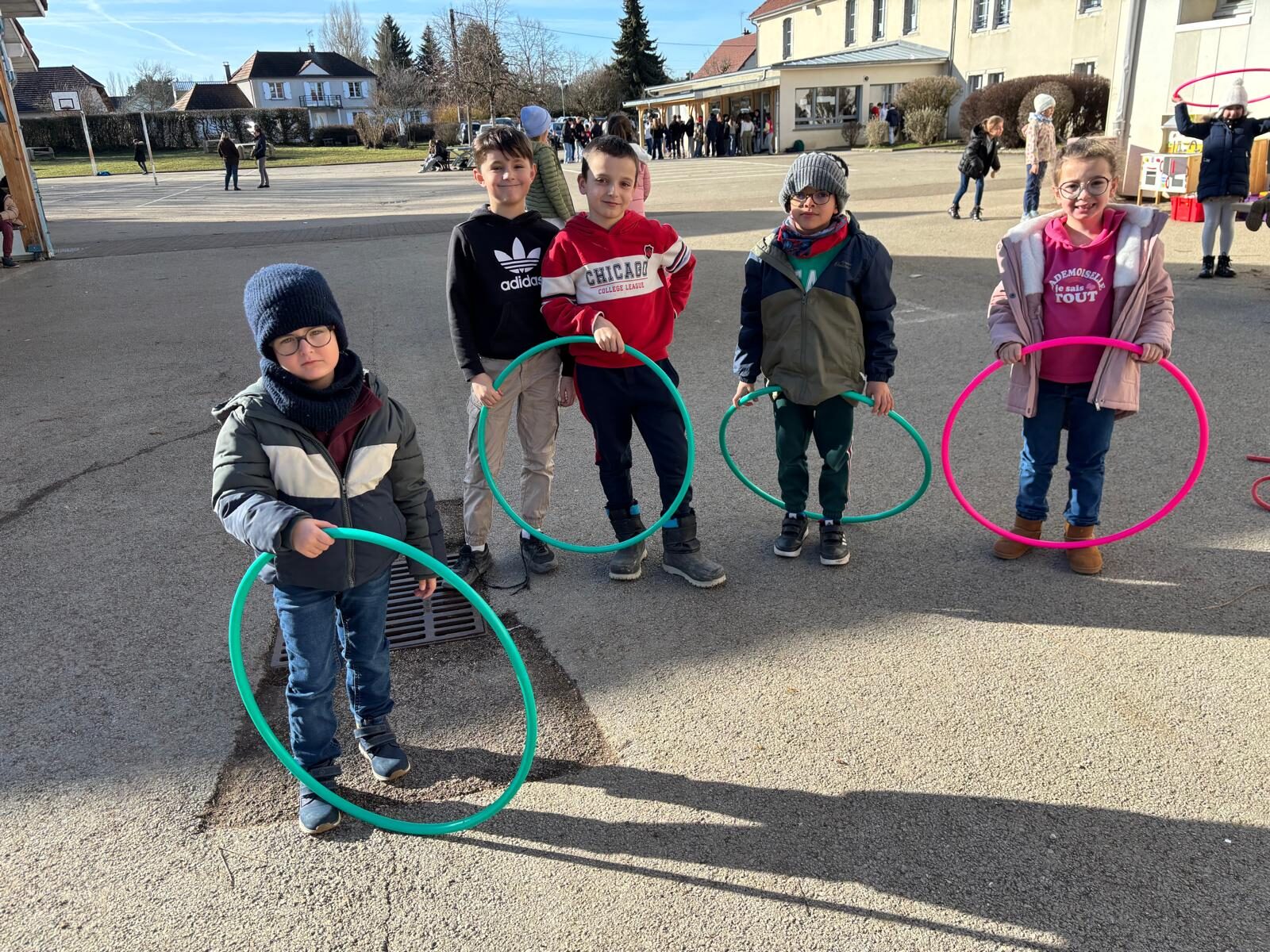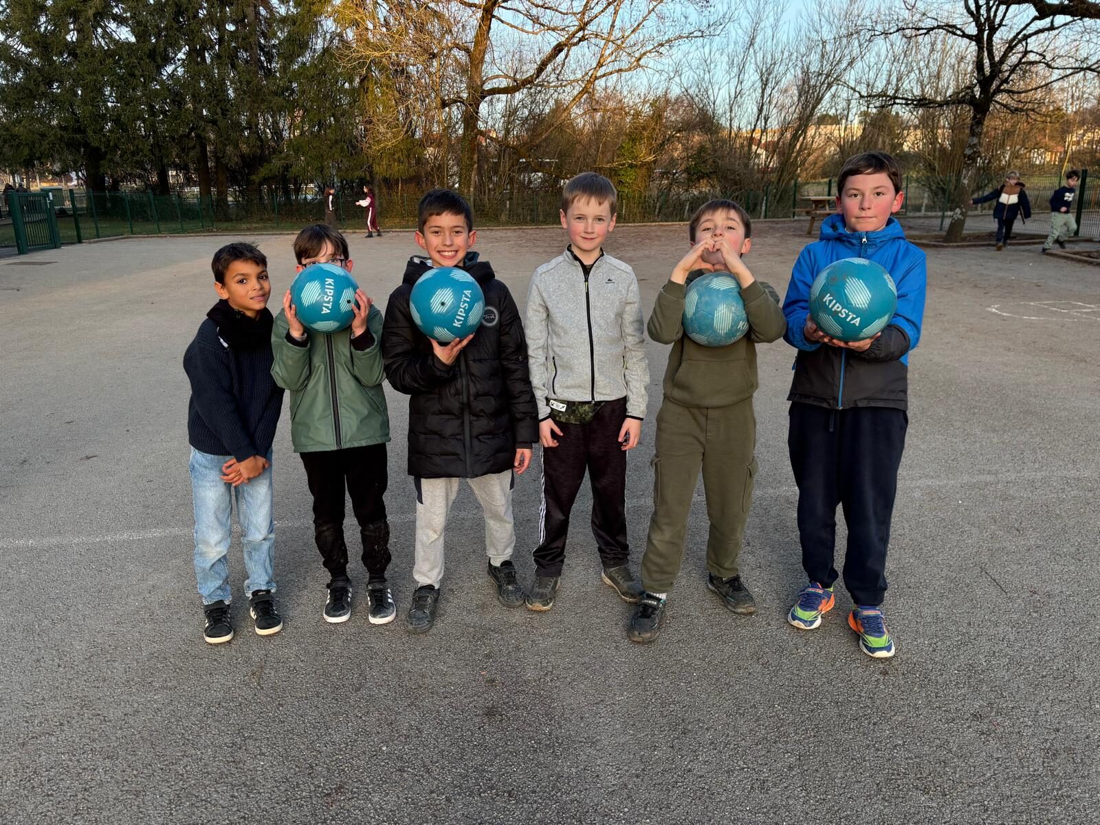 Depuis hier, c’est bien parce que nous avons eu des nouveaux ballons légers pour jouer au foot et des grands cerceaux. C’est l’APEL qui nous les a donnés. On peut jouer avec le temps de midi et le soir avant l’étude.